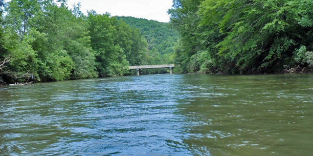 Headquarters Outfitters from the US 64 bridge over the French Broad.